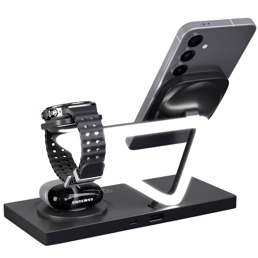 One sleek design replaces three separate chargers. Cleaner space, calmer mind.